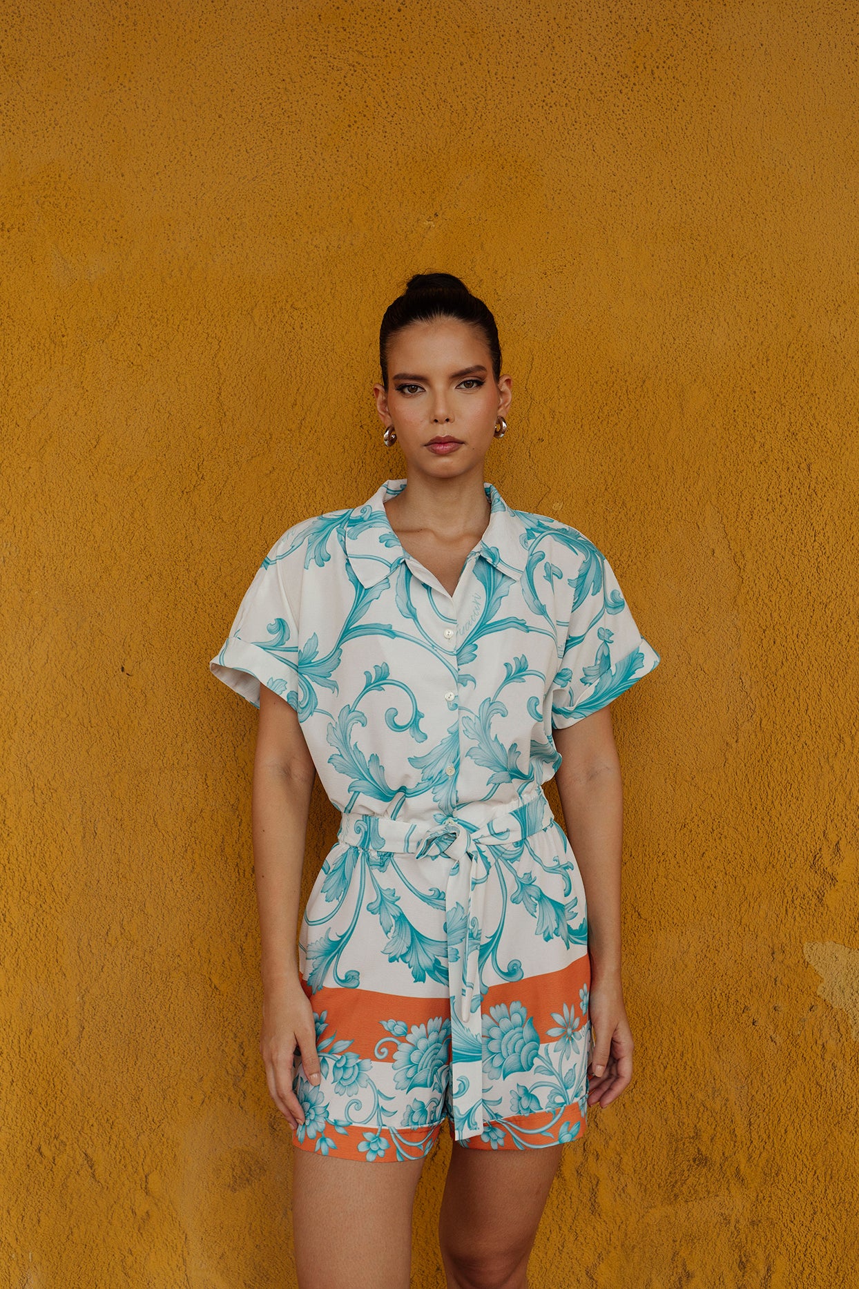 Enterizo de short manga corta, cierre de botones en frente, con cintura elástica y cinturón de ajuste