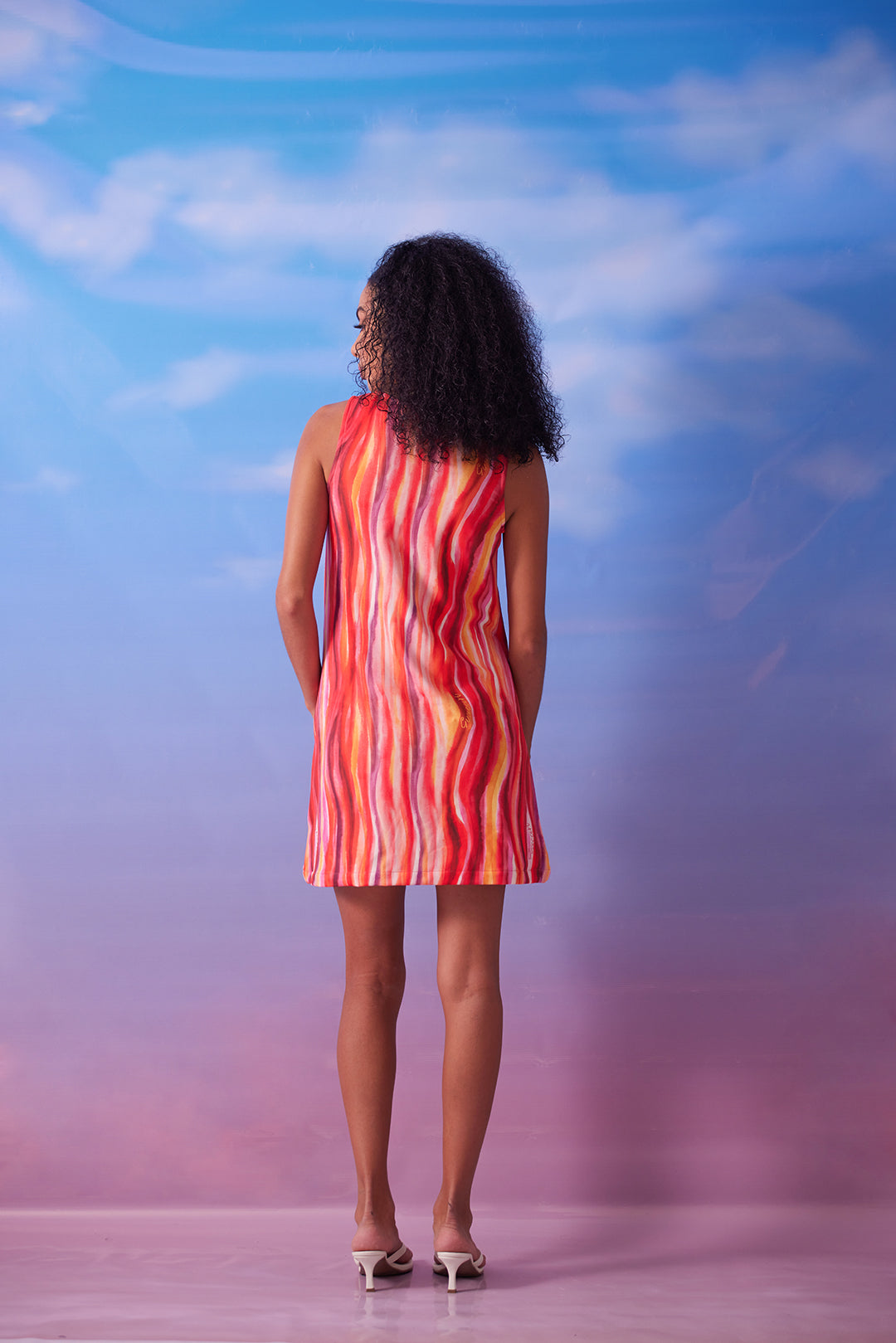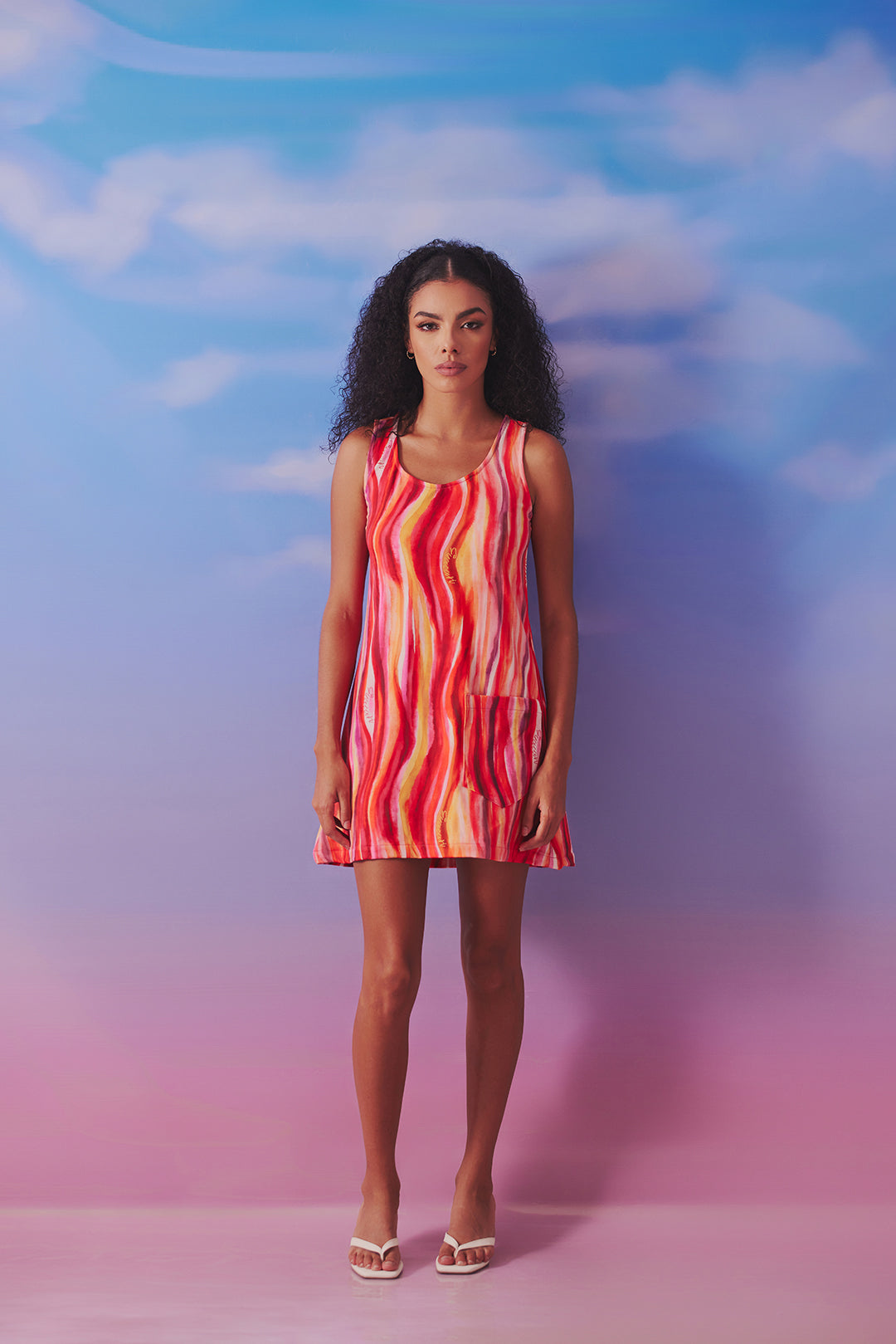 Vestido corto tipo talego, cuello redondo, bolsillo de parche en frente