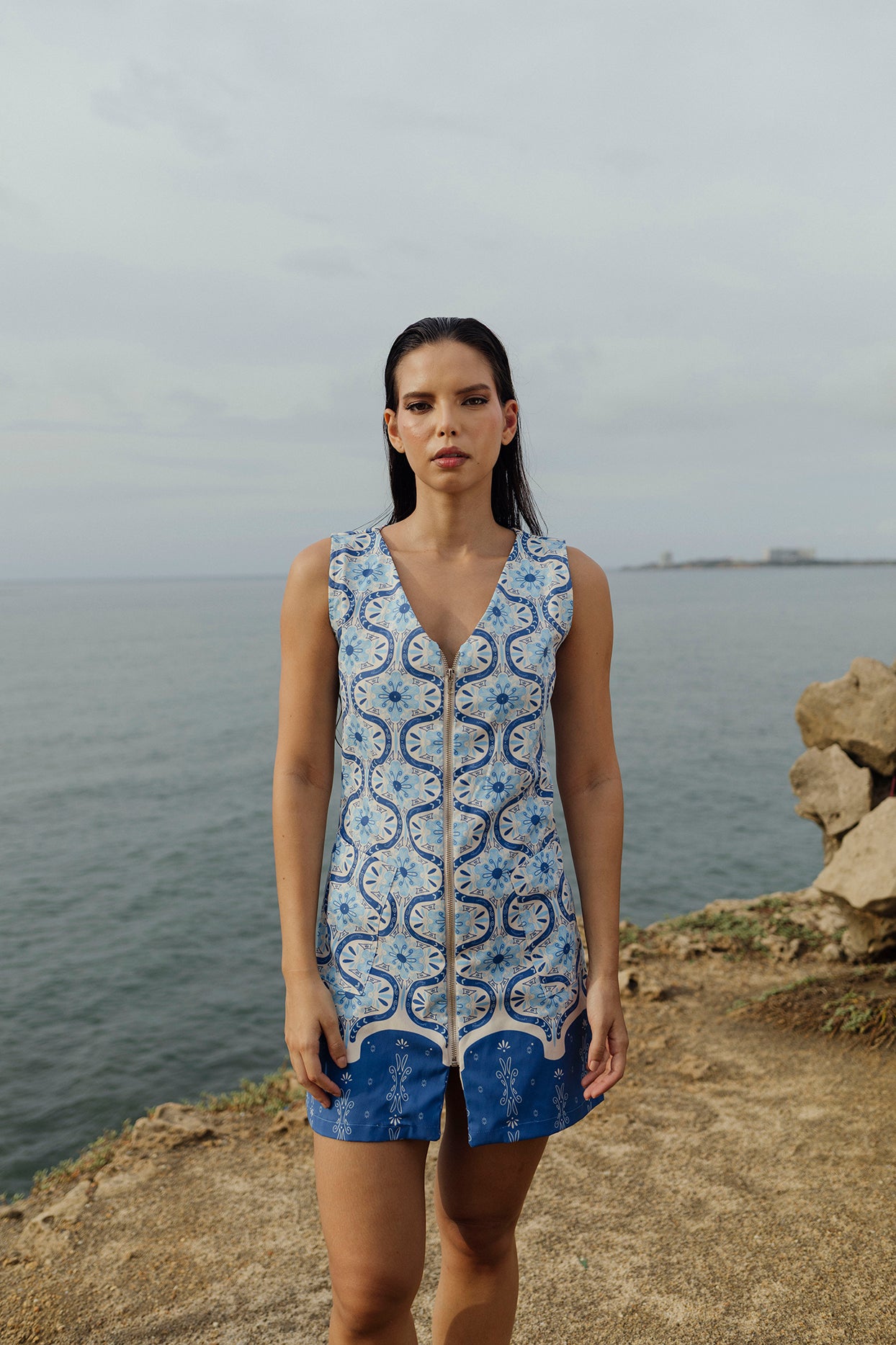 Vestido escote en V, de corte ajustado, cierre de cremallera en el centro delantero, bolsillos de parche en frente